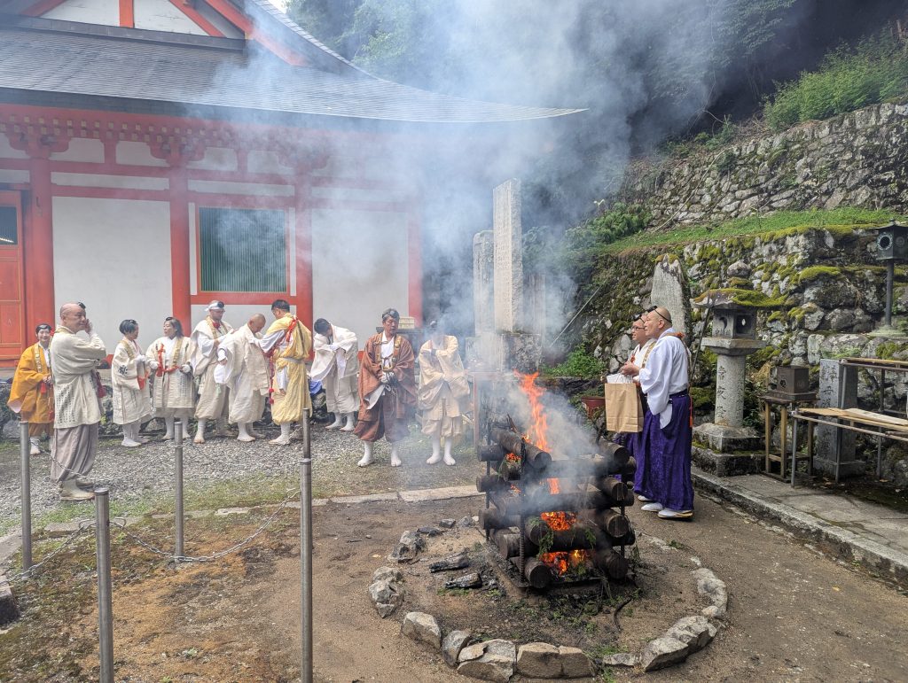 屋外に護摩壇を設けて炎を焚き、