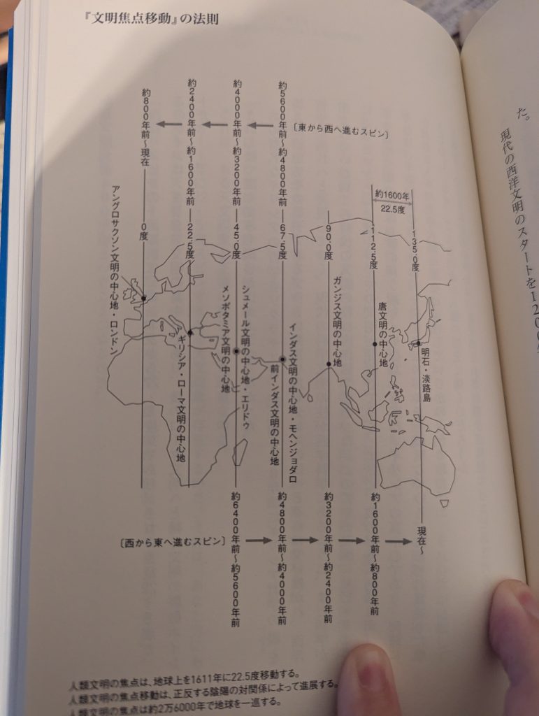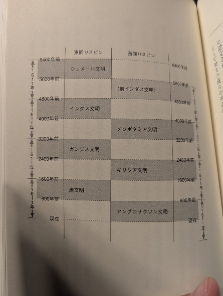 その結果、東回り・西回りのスピンが生じ、約800年ごとに文明の隆盛の波が東西で交互に現れる、という構造です。