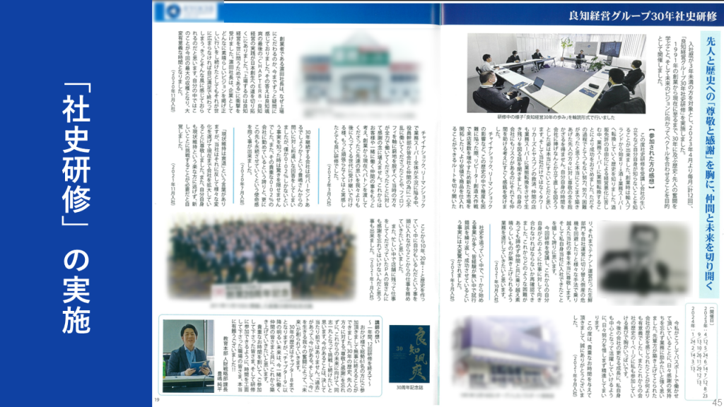 新入社員及び社歴が浅い(3年未満)社員60名を対象に実施。会社の創業の原点、歴史を学び、会社への愛着、尊敬と感謝の気持ち、仲間と共に今と未来を切り開くマインドセットが醸成。